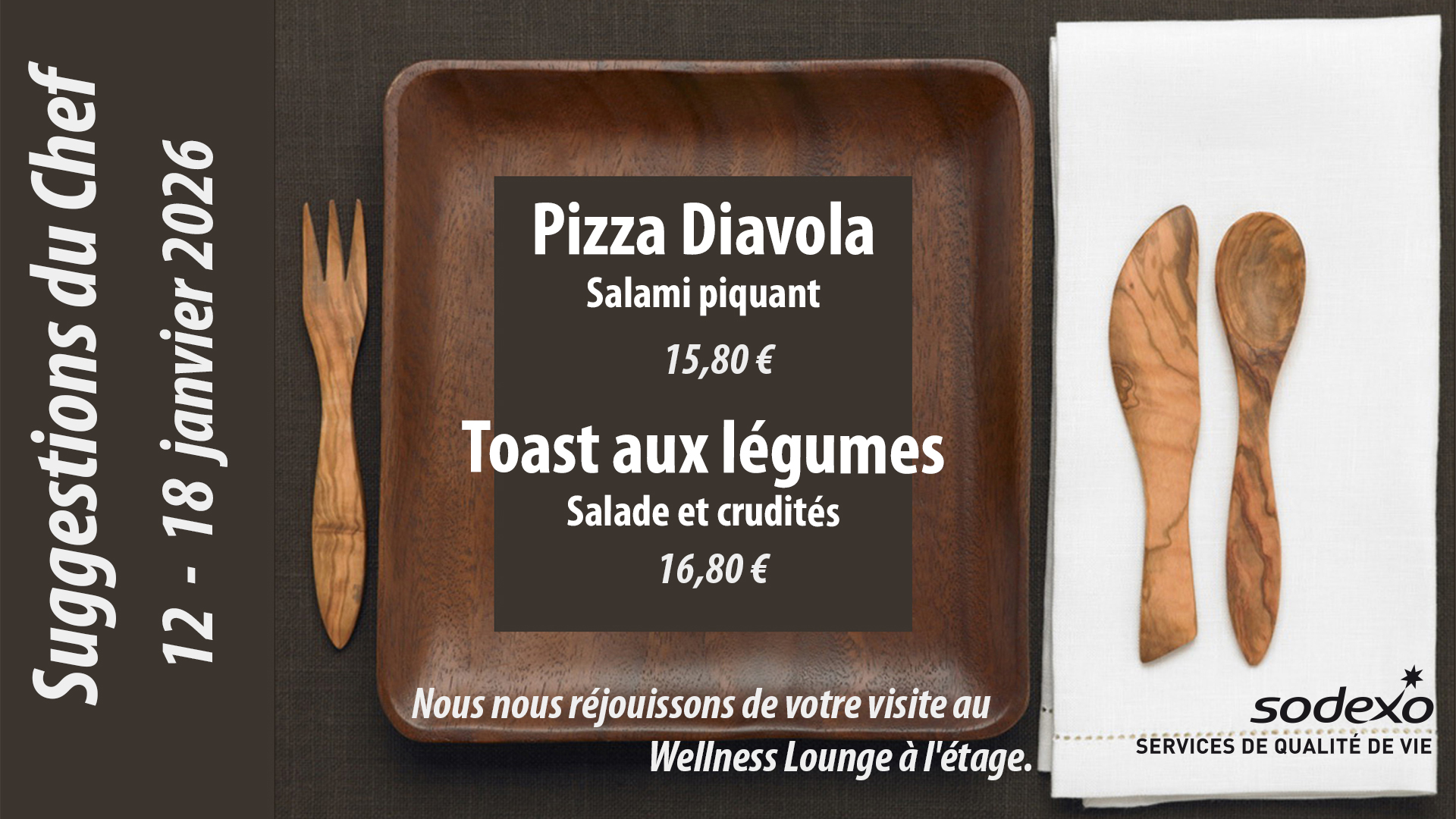 Nous sommes ravis de vous présenter la suggestion du chef de cuisine. Découvrez une création gastronomique unique, préparée avec soin et passion. Laissez-vous surprendre par des saveurs exquises et des combinaisons de goûts inédites. Nous vous attendons avec impatience au Wellness Lounge à l'étage pour déguster cette proposition culinaire d'exception. Venez vivre une expérience gustative mémorable.